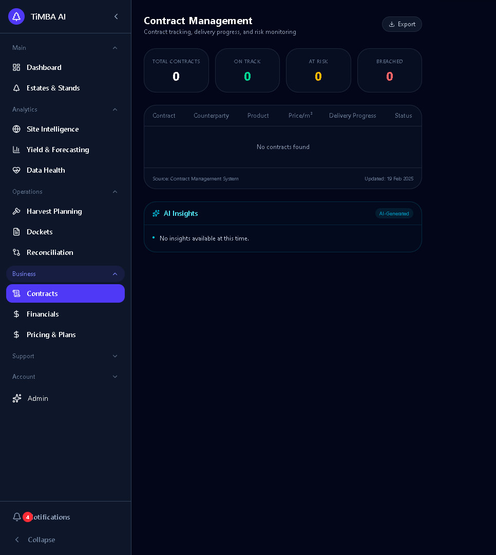 Complete supply chain visibility from forest to mill, with real-time tracking of harvest schedules and transportation logistics.