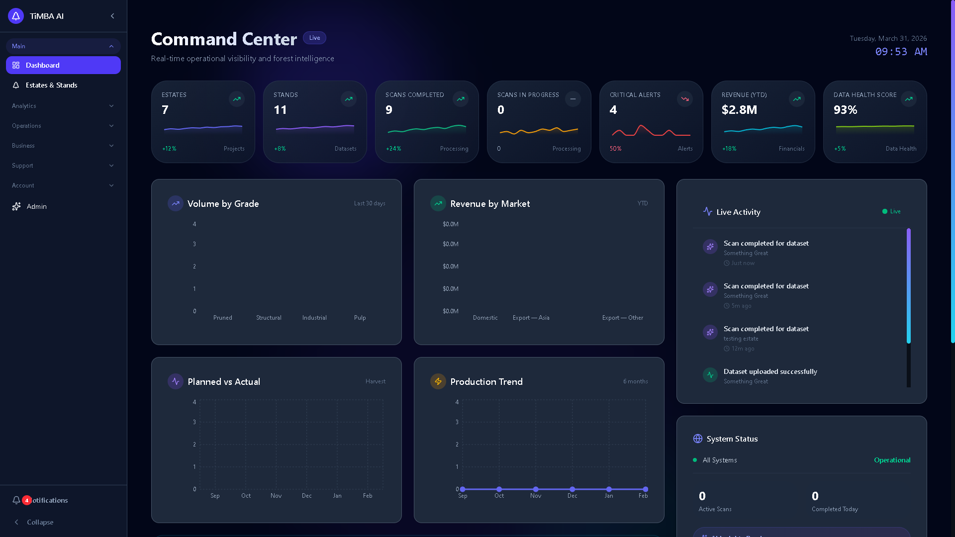 Your command center for real-time operational visibility. Track KPIs across all estates and stands, monitor active scans, view system health, and access AI-powered insights at a glance.
